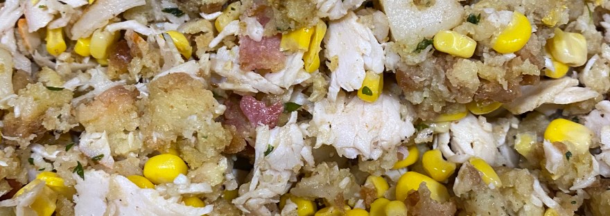 In the pot with potatoes, Turkey, and corn… Now add in the stuffing and mix it all together. Then crumble the bacon on top and mix again. As an optional step, cut up 1-2 tablespoons of butter and fold it into the mix for some added richness. Cover and cook for just enough time to reheat the bacon and stuffing (and melt the butter if you added it).